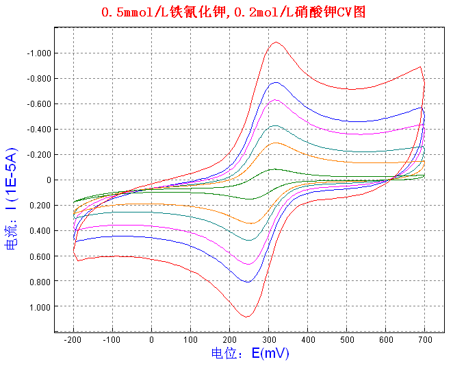 4. 將不同濃度的鐵氰化鉀(Fe(CN)63-)溶液的循環(huán)伏安曲線,同樣進(jìn)行疊加可以發(fā)現(xiàn),峰