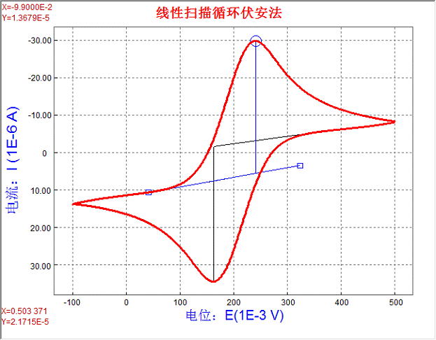 2. 即第三和第四段曲線,根據(jù)循環(huán)伏安曲線特點(diǎn),用半峰法進(jìn)行峰測量,測量結(jié)果如圖: