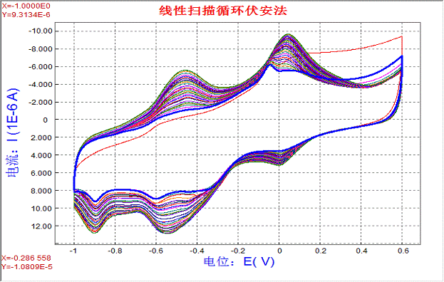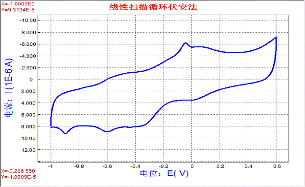 起始點(diǎn)為:-200mV 終止電位:600mV 掃描速度:50mV/S 取樣間隔:1mV/S