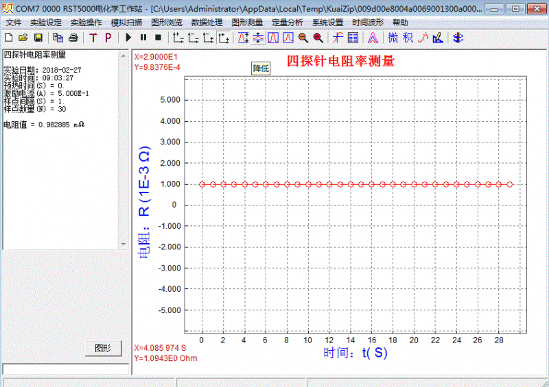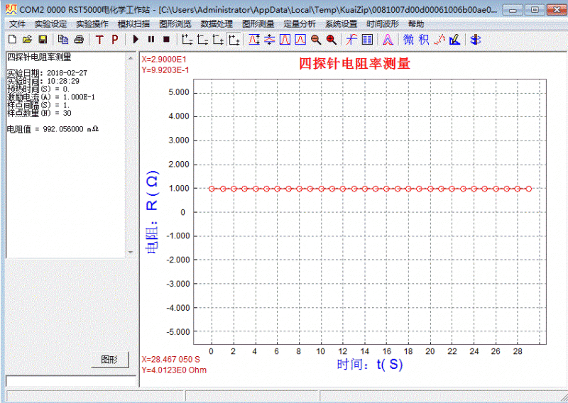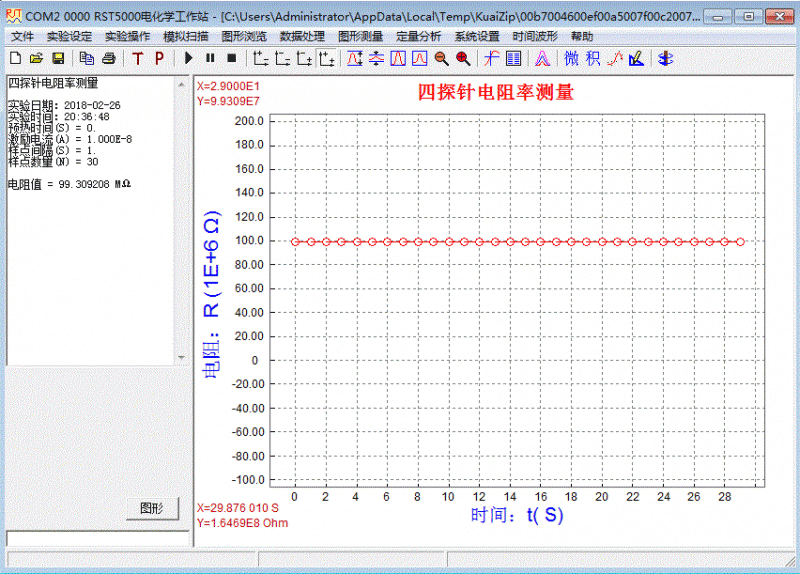 該測試方法與電化學(xué)工作站中的其他方法一樣,軟件界面友好、參數(shù)設(shè)置簡單明了。啟動測試后,儀器按設(shè)定的參數(shù)自動連續(xù)采集數(shù)據(jù),在屏幕上實(shí)時顯示電阻-時間曲線。測試結(jié)束后,根據(jù)電阻形態(tài)參數(shù)自動換算成電阻率及電導(dǎo)率,無需人工計(jì)算。配備的專用電化學(xué)工作站軟件在電腦上運(yùn)行,可隨時顯示、保存、打印數(shù)據(jù)和圖形,以備存查。